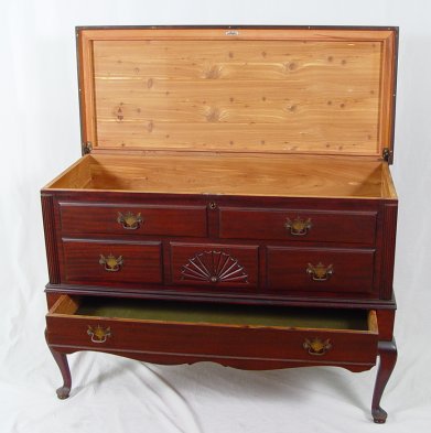 MAHOGANY QUEEN ANNE STYLE CEDAR CHEST: Looks like a low boy. Blanket chest over one drawer. Shell carving, cabriole legs. 34 1/2''h, x 45 1/4'' x 19''. Comes with a new Lane lock to be installed.