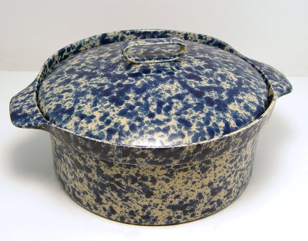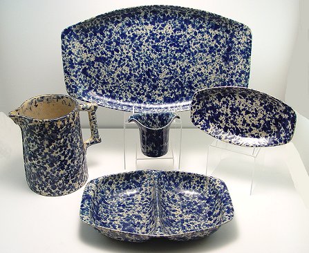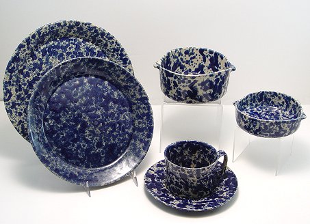 40 PIECE GROUP OF BENNINGTON POTTERY BLUE SPONGEWARE: Deep cobalt blue spongeware from Bennington, Vermont. Includes large covered Dutch oven, 12'' dia., a platter, 16 1/2''l, a divided serving bowl, 12''l, creamer, 10 plates, 9 3/4'' dia., 11 plates, 6'' dia., 4 plates, 8 1/2'' dia. 6 bowls with tab handles, 5 1/8'' dia, a cup and saucer, and 2 berry bowls, 4 1/2'' dia. Impressed Bennington hallmark.