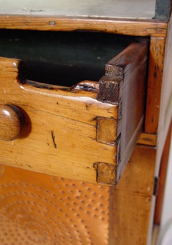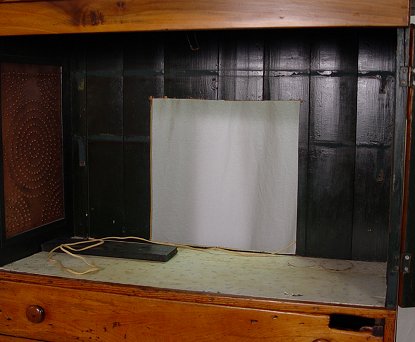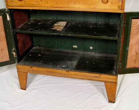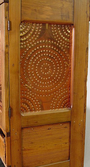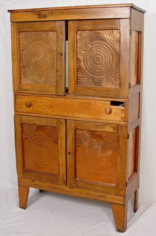 AMERICAN COUNTRY PUNCHED COPPER PIE SAFE: Copper in the doors and side panels. Two doors, over 2 drawers over 2 more drawers. Converted in the back for use as an entertainment center. Please call for condition.