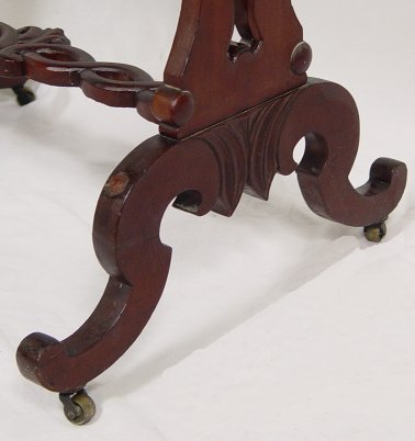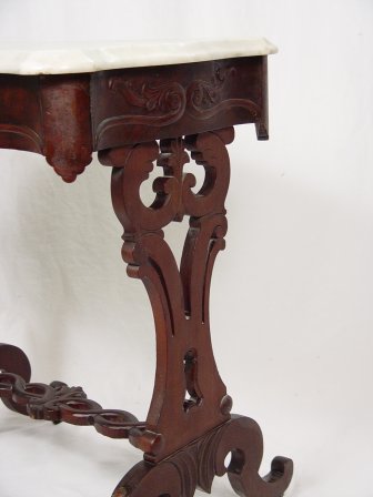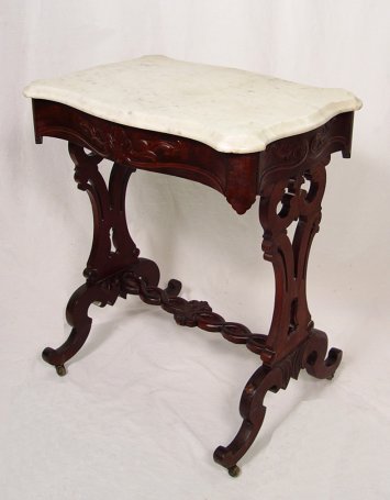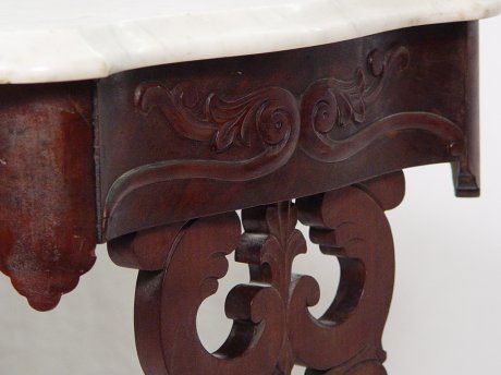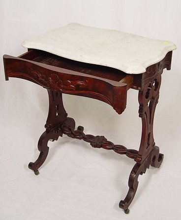 VICTORIAN MARBLE TOP STAND: Shaped and beveled white marble top over a flame grained mahogany, one drawer stand. The side legs and connecting stretcher are pierce carved, scrolled feet have original castors. Approx. 27''h. x 24'' x 17''.