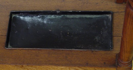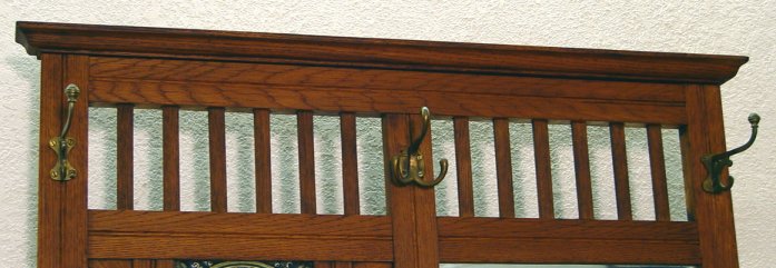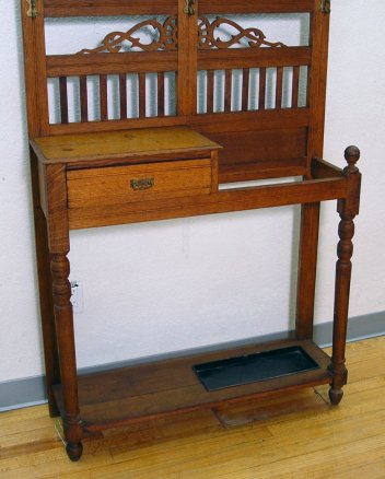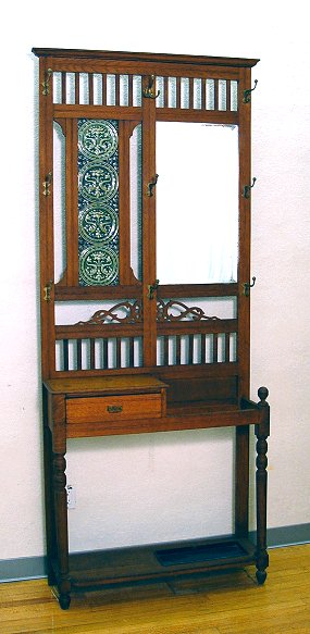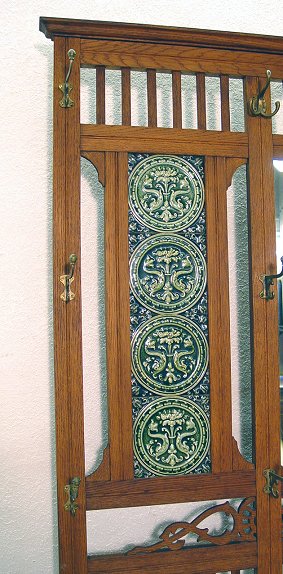 ARTS & CRAFTS ERA OAK HALL TREE SET WITH TILES: Four embossed green tiles set into a golden oak hall tree. 9 hooks, beveled mirror, one drawer storage compartment, umbrella tray. The mirror is 14 1/2'' x 27''. The piece overall is 89''h, x 37''w. Please note stain spots above the drawer.