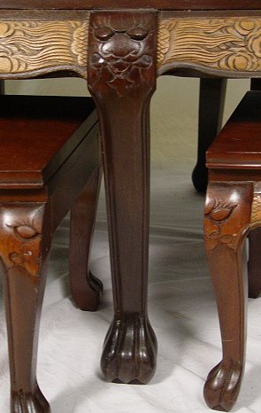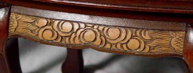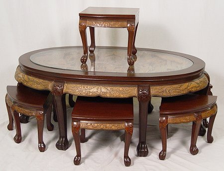 HIGHLY CARVED CHINESE TEA TABLE WITH 6 STOOLS: Deeply carved scenic center with glass top. 6 stools fit snugly under the oval table. Unusual combination of dark and light mahogany. 20''h. x 50'' x 30''. Stools are 12 1/2''h.
