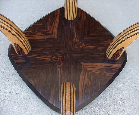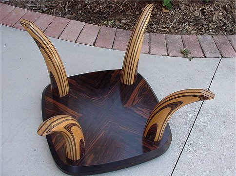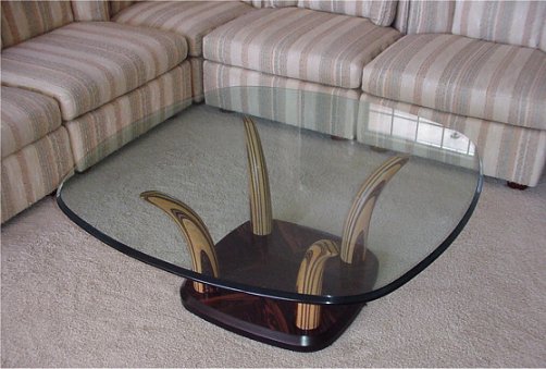 HENREDON MODERNE GLASS TOP COFFEE TABLE: Layered wood base and horn shaped supports. 16''h, the glass is approx. 43'' x 43''.