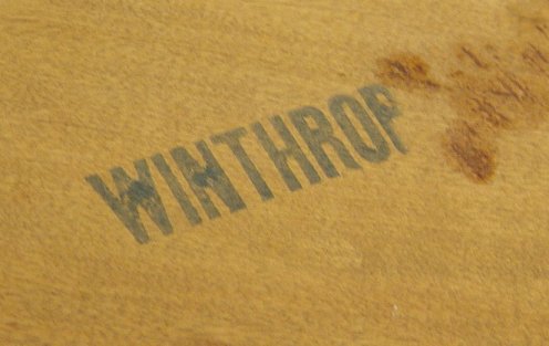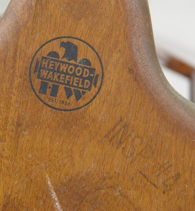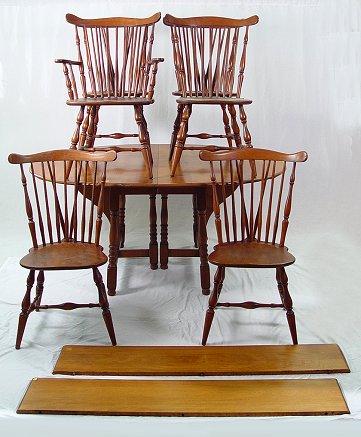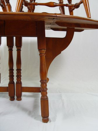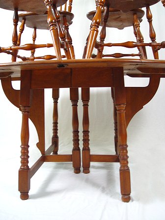 HEYWOOD WAKEFIELD WINTHROP DINING TABLE AND 6 CHAIRS: Oval drop-leaf swing leg table with 2 leaves and table pads. Six brace back Windsor style chairs. Chairs and table bear the eagle stamp. The table is 64'' x 53'', plus two 10' leaves. The chairs are 36''h. 22''w.
