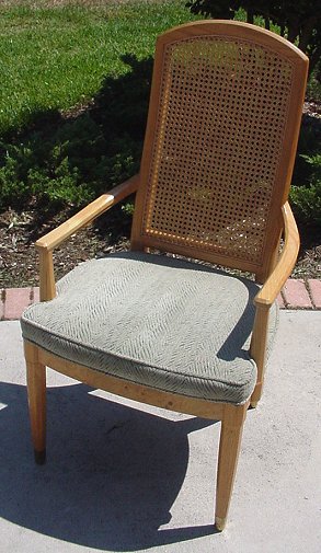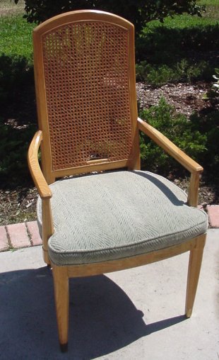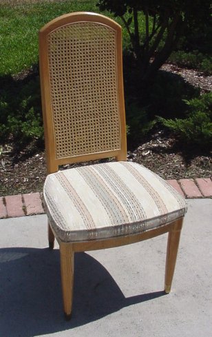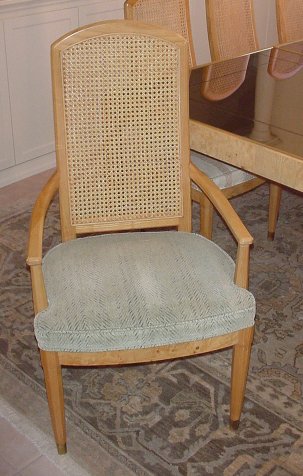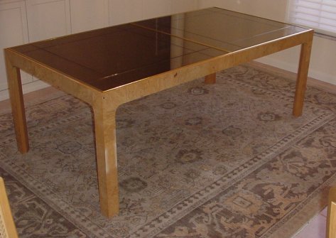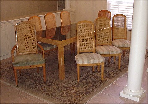 HENREDON SCENE TWO DINING TABLE AND 8 CHAIRS: The table and two leaves have recessed beveled glass. The table extends to 121''l, it is 81''l without the leaves, 41''wide. There are 8 chairs, 2 with arms. Cushion upholstered seats. The backs are 42''h. Impeccable condition.