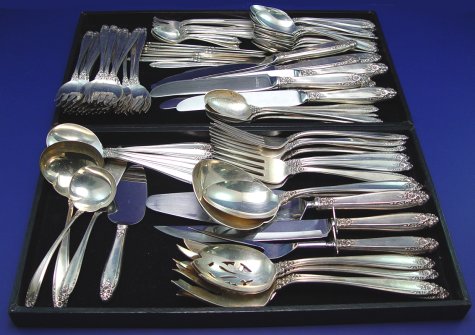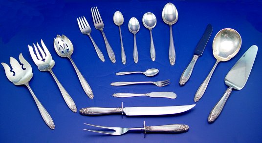 STERLING FLATWARE SERVICE IN THE ''PRELUDE'' PATTERN BY INTERNATIONAL: 101 pieces to include carving set, pie server, cheese server, large casserole spoon, service spoon, 2 large meat forks, gravy ladle, sauce ladle, master butter, 2 slotted spoons, 8 dinner knives (9 1/2''l), 9 dinner forks,(7 7/8''l), 6 soup spoons, 6 iced tea spoons, 6 dem-tasse spoons, 7 butter spreaders, 6 cocktail forks, 20 teaspoons and 20 salad or pastry forks. No monogram.