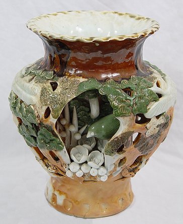 DIMENSIONAL JAPANESE POTTERY VASE: Tin glazed earthenware in natural tones of green and brown. 10 1/4''h, 7'' dia.