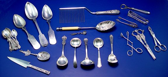 LOT OF ESTATE STERLING: To include, Wallace ''Nile'', 1908, cream ladle, stylized monogram, 5 5/8''l.; Reed & Barton ''Marlborough'', 1906, egg bowl sugar spoon, 6 1/8''l., worn monogram; Frank M. Whiting ''Adams'', 1944, cream ladle, 5''l., bend to handle; unmarked fruit server with Bakelite? handle, 9 1/2''l.; R. Wallace sugar shell, 6''l.; Kirk ''Betsy Patterson'', 1932, bottle opener, 5 5/8''; Kirk ''Rose'', 1937, angel food cake comb; 3 Alvin ''Orange Blossom, old'', 1905, demitasse spoons, 4 1/8'', monogrammed; Kirk letter opener in one of the repousse flower patterns, 7 1/8''l.; 2 fiddle back serving spoons marked R. Safford, monogrammed MB?, 8 3/4''l.; assorted tongs, demitasse and souvenir spoons; large serving spoon; wonderful olive fork with cattail motif handle, 8 1/4''l.; and grape shears. Sold as a lot.