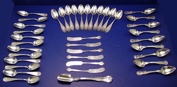ESTATE STERLING FLATWARE: To include, Gorham ''Kings II'', 1885, cheese scoop, 8 1/8''l.; 9 teaspoons in a pattern very much similar to th Gorham Kings II but, I believe these are English, marked E. Stebbins & Co, star head? and anchor, 6''l., monogrammed verso MT; 12 Towle ''Clover'' teaspoons, 5 7/8'', monogrammed verso MWH; 11 Whiting ''Indian'', 1880, teaspoons, 5 7/8'', monogrammed W?; and 6 Alvin butter knives, 6''l. Sold as a lot.