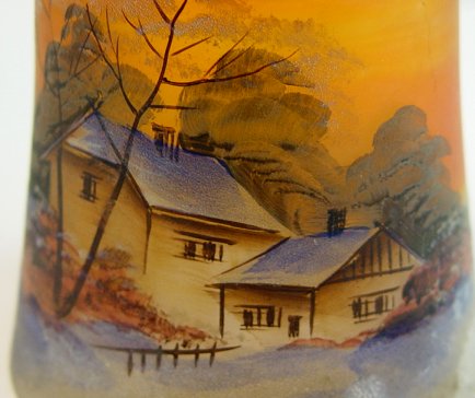 PAIR OF ART GLASS SHADES: Flashed iridescence with handpainted winter scene. The rims are approx. 2 1/4'' dia. 5 1/2''l. No chips or cracks.