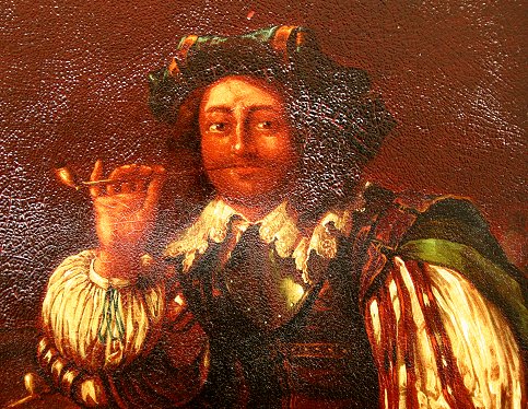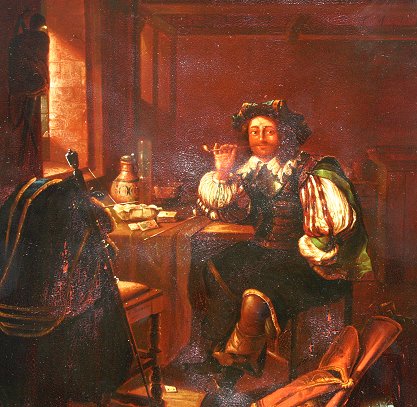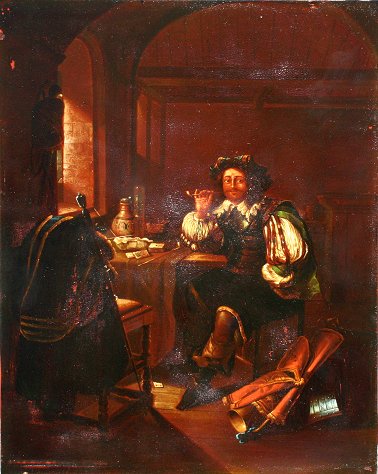19TH C. OLD MASTER OIL ON TIN OF A CAVALIER SMOKING A PIPE: 15'' X 12'', incised ''R'' verso. Condition - Some paint separation and several small scrapes and areas of paint loss, cracklure, needs cleaning. Est. $800/1200**