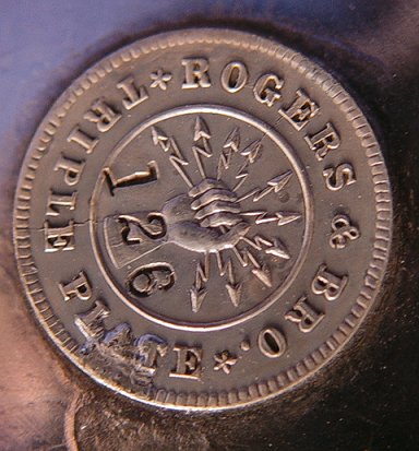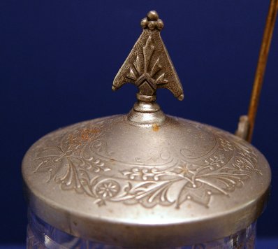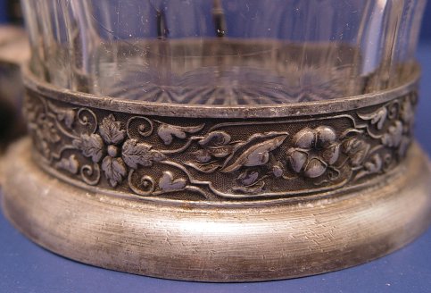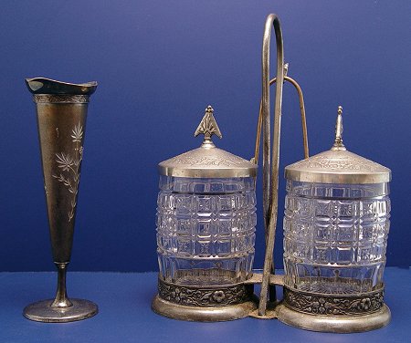 VICTORIAN DOUBLE PICKLE CASTOR: Matched pair of pressed glass jars in a chased silverplated holder. Claw foot tongs are 7 1/4''l. The loop handle holder is 9 1/4''h. Sold with a bright cut Roger & Bros. Victorian bud vase, 7''h.