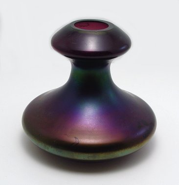PURPLE IRIDESCENT ART GLASS VASE: Maker unknown. 6''h.
