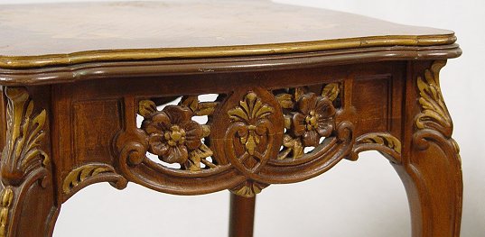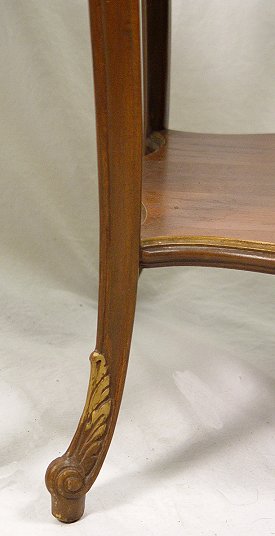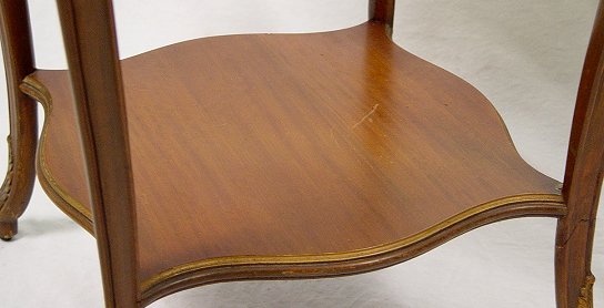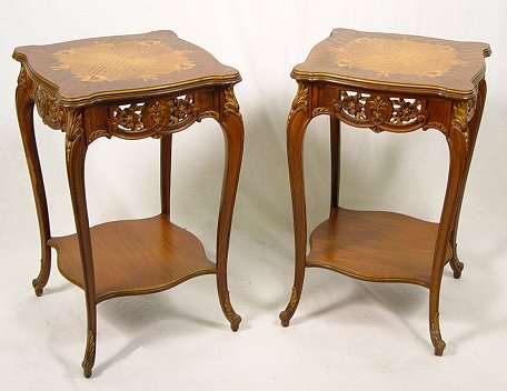 PAIR OF MARQUETRY SIDE TABLES: Two shaped tiers with the upper having carved skirt and marquetry top. 28''h, x 16 1/2''. Please note worn finish.