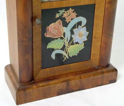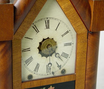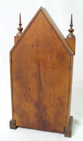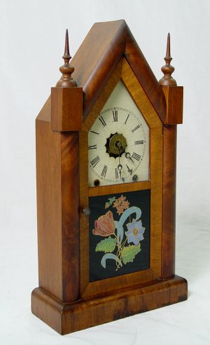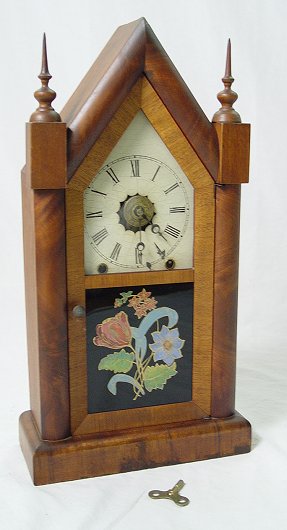 NEW HAVEN GOTHIC STYLE STEEPLE SHELF CLOCK WITH ALARM: Original works, paper with company information and directions line the interior. Nicely grained mahogany case, reverse painted glass panel. Key and pendulum included. 20 1/2''h, 10''w. 4 1/2''.