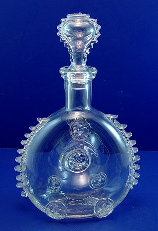 BACCARAT FRENCH CRYSTAL DECANTER FOR REMY MARTIN: Reproduction of a decanter used during the period of Louis XIII and now made exclusively by Baccarat for E. Remy Martin Cognac. Fleurs de lis decorate the bottle. 10 3/4''h.