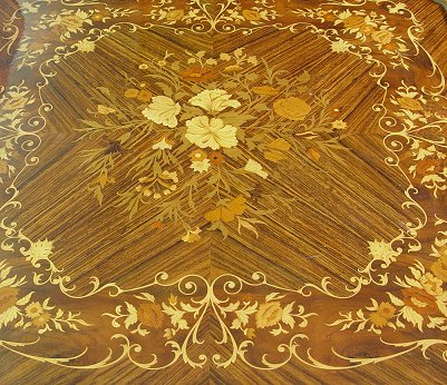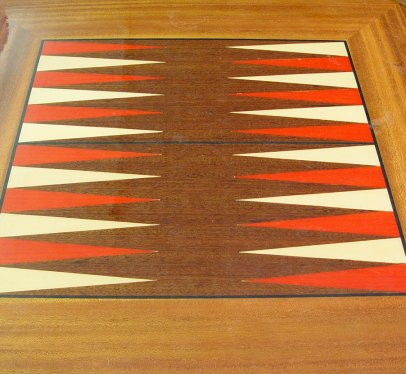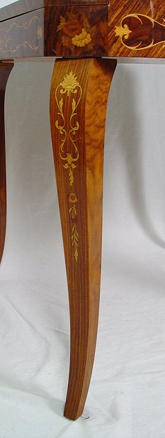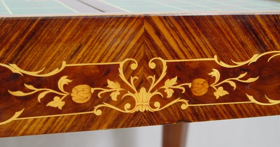 MARQUETRY INLAY GAME TABLE: Five function table. The top has a backgammon board on the reverse, there is a checker reverses to felt top board, the lower level is for dice. Compact and self storing. Condition is good. 29''h, x 30'' square top.