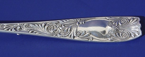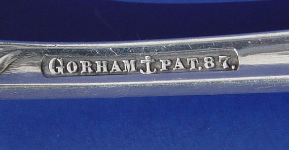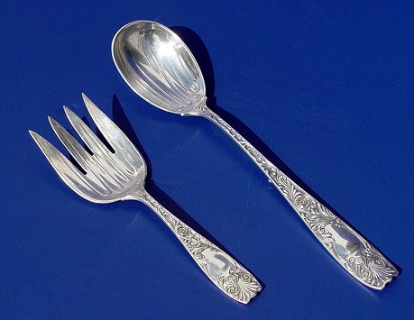 GORHAM SERVING SPOON & FORK: Wonderfully detailed embossed swirling pattern of unknown name, ribbed bowl and tines. Fork 8 5/8''l. x 2 1/2''w., spoon 12 5/8''l. x 2 5/8''w. x approx. 5/8''deep bowl. Both marked Gorham anchor Pat.87., button support to back.