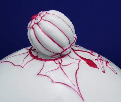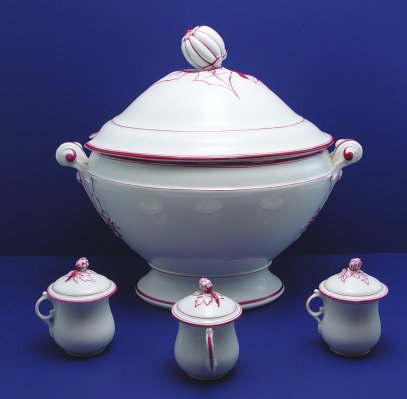 FINE IRONSTONE TUREEN: Scrolled handles and fruit finial on tureen of pure white ground with deep fuchsia accents. 14'' dia., 12''h. Sold with 3 matching pots de creme. No chips or cracks.