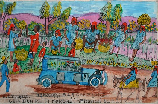 DUCASSE, Gervais Emmanuel, (Haitian, 1903-1988): ''Kenscoff Ala Campagne'', Oil and Marker/Masonite, 15 3/4'' x 24 1/4'', signed lower left, marked verso brought in Haiti in 1978, George Nadar Art Gallery card affixed verso.