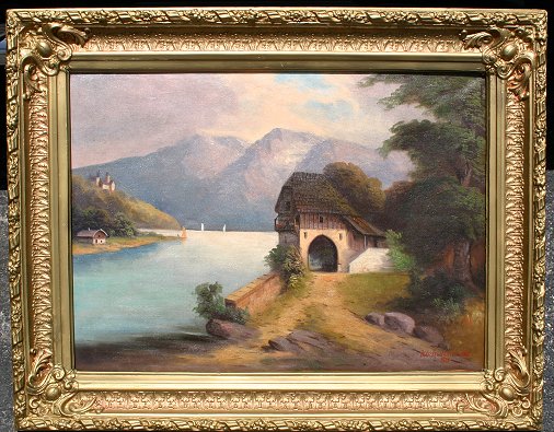 KLEINSCHMIDT, (European, 20th C.): Riverside landscape, O/C, 22 3/4'' x 31'', signed lower right and dated 86', encased in period embossed gilded frame with gold overpaint. Condition - Relined, sporadic in-painting, slight fluorescence in signature and point, minimal spec paint loss.