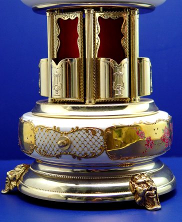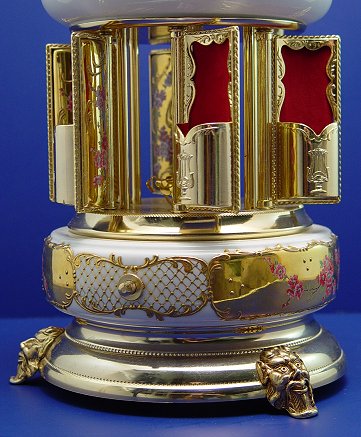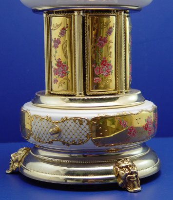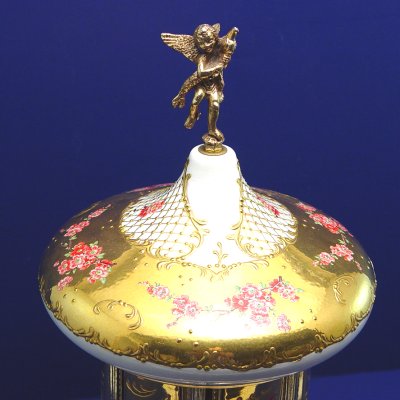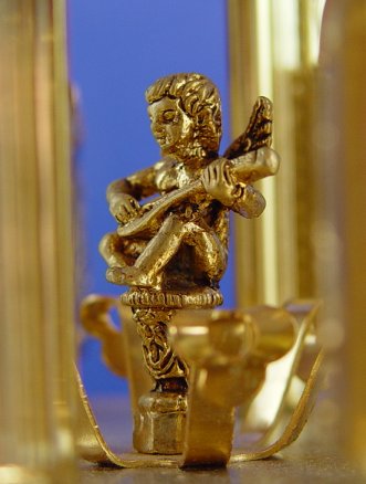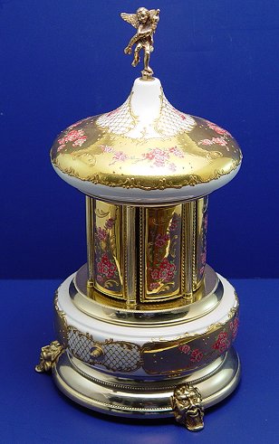 MUSICAL ANIMATED CIGARETTE DISPENSER: Surmounted by a cherub, the compartments open to reveal another cherub. Thorens Swiss movement plays ''Lara's Theme''. In working order, 15''h.
