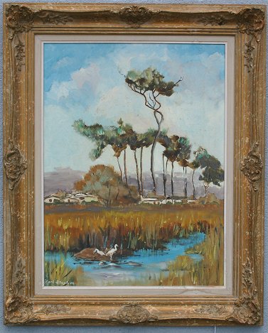 STEPHAN, Karl, (European, 1900-): Marsh landscape with village in the distance, O/CB, 24'' x 18'', signed lower left, encased in carved and gilded frame with minor wear.