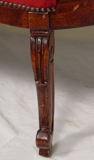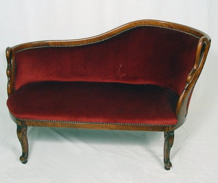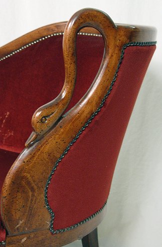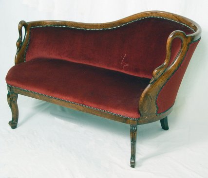 CARVED SWAN NECK VICTORIAN STYLE SETTEE: Curved frame in the form of a swan. Later 20th C made in Italy for Grant International of Great Britain. Upholstered in burgundy velvet. 46''l, 33''h. at the highest curve.