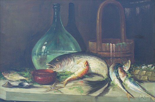 VITALI, (Italian, 20th C): Table top still life of fish, O/C, 24 x 36'', signed lower right, carved Mexican frame, rough wear. Condition - Needs cleaning, small puncture in lower left corner, some craquelure in upper right corner.