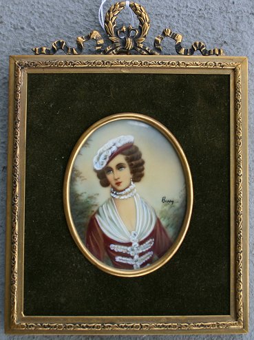 4 PC MINIATURE PAINTING ON CELLULOID LOT: All pieces are encased in embossed brass frames, two of which are jeweled. The paintings depict young European ladies, measure 3'' x 2 1/2'', probably first half of the 20th century.