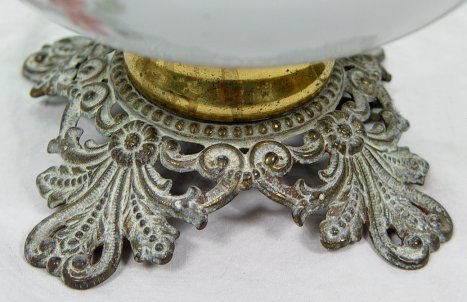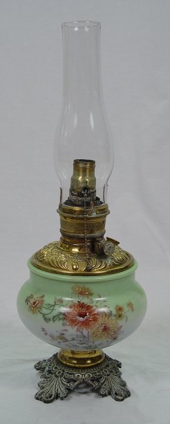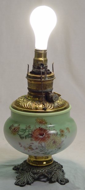 VICTORIAN ERA OIL LAMP: Electrified. Floral decorated glass with ornate brass font and fittings. 21 1/2''h. overall with glass chimney.