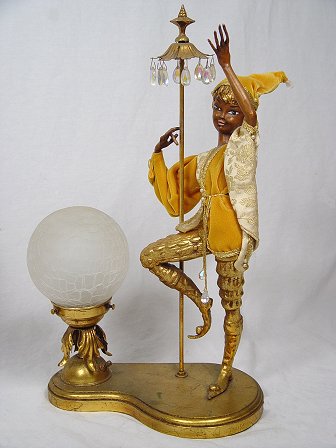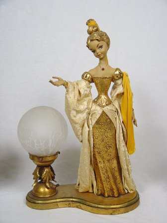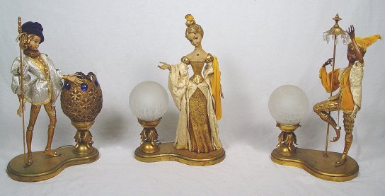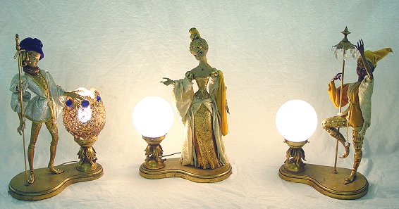 SET OF 3 NOVELTY FIGURAL LAMPS: Figures dressed in elaborate velvet and metallic costume of the Venetian Golden Age. Two have crackle glass globe shades, the other has a reticulated brass shade. Approx. 22''h, the bases are 13''l. One is signed A.R.P.