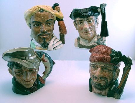 4 LARGE ROYAL DOULTON CHARACTER JUGS: ''The Poacher'' D6429. ''Lumberjack'' D6610. ''Gunsmith'' D6573 from the Williamsburg Collection. And from the Shakespear Collection ''Othello''. Each about 7'' h.