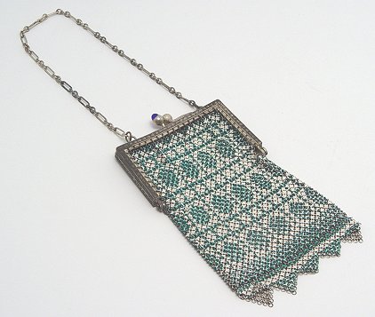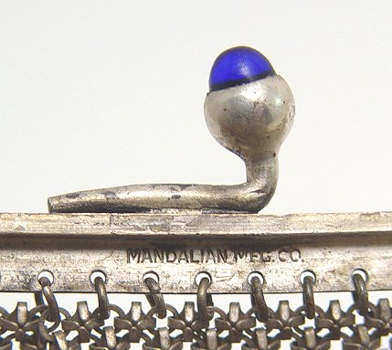 MANDALIAN ENAMELED MESH PURSE: Geometric turquoise and pearl colored enamel. Silvertone metal frame and chain handle, cobalt glass in the clasp. The body of the purse is 5 1/4'' x 3''. Signed ''Mandalian Mfg. Co''. Good condition.