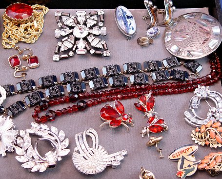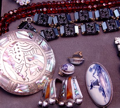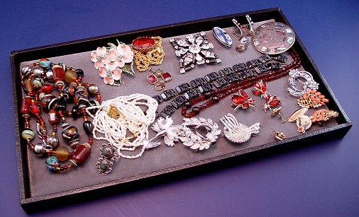 TRAY LOT OF ESTATE COSTUME JEWELRY: To include, Lisner blue rhinestone brooch; Trifari brooch and earrings; Bond Boyd Sterling flower pin; Delft brooch and earrings; Mexican sterling brooch/pendant, earrings, ring; gold filled earrings; red stone insect ensemble; porcelain flower brooch and matching earrings; multi strand necklace of fresh water pearls, 18''; colorful glass and silver? bead necklace, 44''l.; red stone pendant from Germany; red faceted bead necklace and black floral pierce bead necklace; even a Labatt's pin. Sold as a lot.