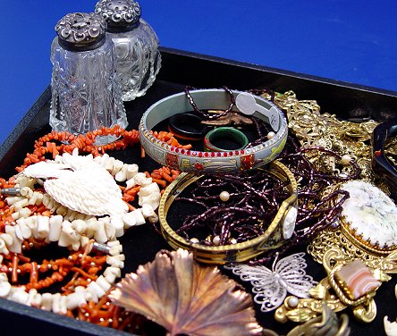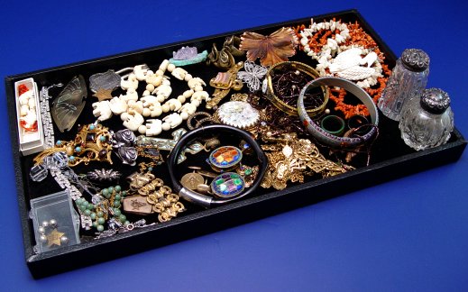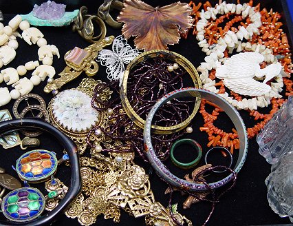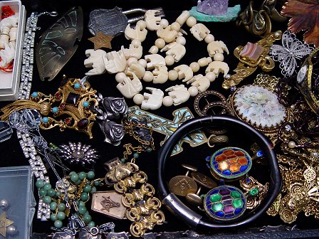 LOT OF ESTATE COSTUME AND FASHION JEWELRY: To include, carved elephant necklace; Florenze brooch; Tortolani rose clip earrings; grape vine motif necklace with jade bead grapes; enamel turtle necklaces; white and orange coral necklaces; cut glass shakers with sterling tops; Bakelite? bangle; free form Victorian brass rings; glass rings; Masonic cuff links and watch fob with fob ending in a gold Masonic medal; bracelets to include, Siam sterling panel, 7''l., shaped wood? bangle, open work faux cameo marked R&F; 1866 Veteran button, Hoover button; etc. Large varied selection sold as a lot.