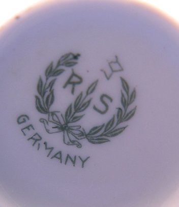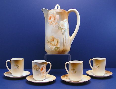RS GERMANY WHITE ROSE DECORATED CHOCOLATE POT WITH 4 CUPS & SAUCERS: The pot is 9''h, the cups are 3''h. No chips or cracks.