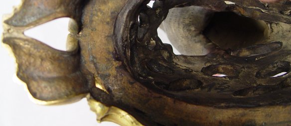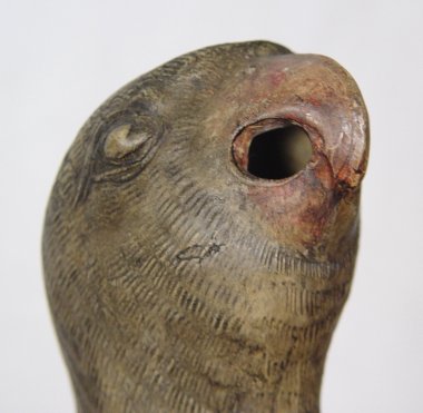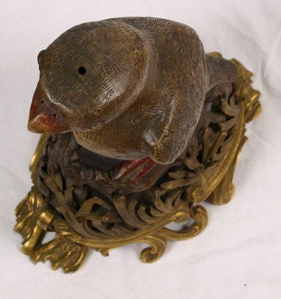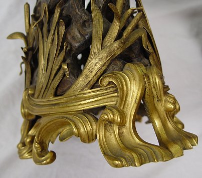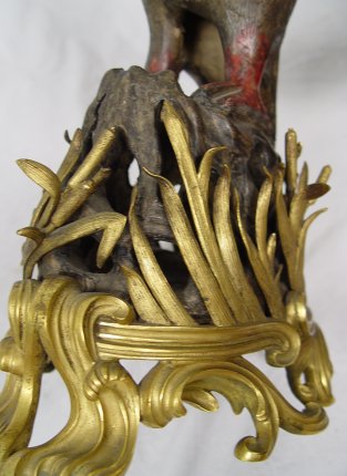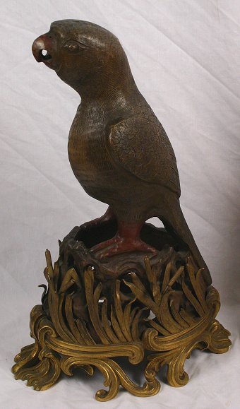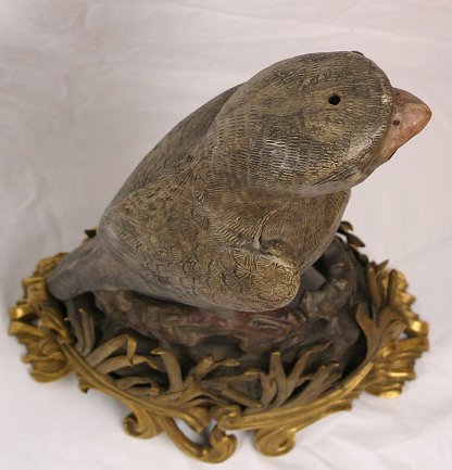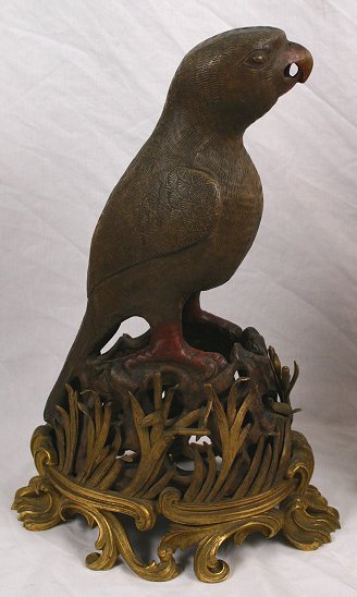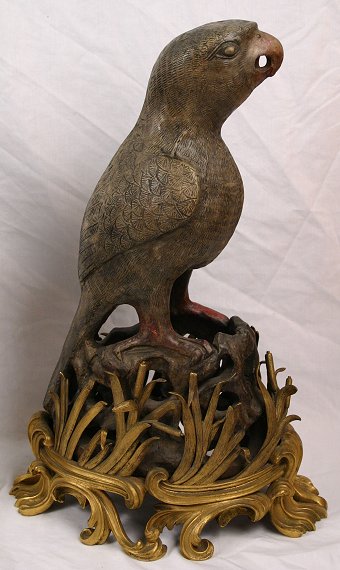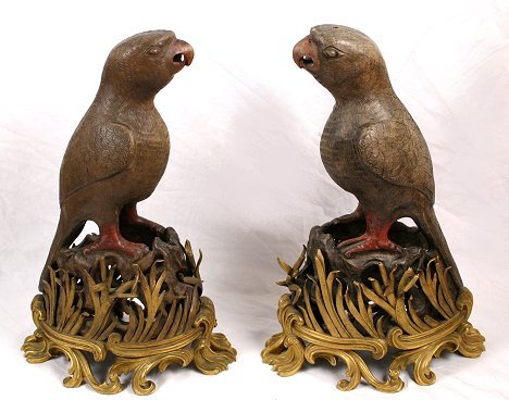 MONUMENTAL PAIR OF 19th C JAPANESE CERAMIC ORMOLU MOUNTED BIRDS: Birds of prey resting on open pierced rockwork, in French bronze mounts of scroll work and cat tails. Evidence of red glaze on the beaks and talons. 17''h. overall, base is 12'' oval. Bronze mount is 6''h, birds are 14 1/2''h. Very good condition. Est. $40000/60000**