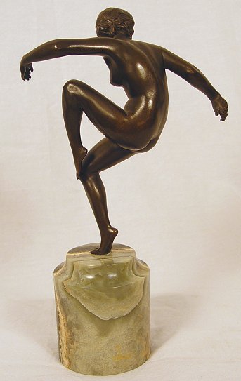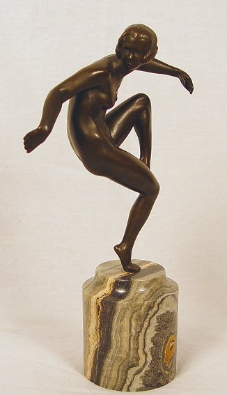 BOURAINE, Antoine, (French, 20th C): Nude Deco Dancer, Bronze, 8''h., variegated marble pedestal, 11 3/4'' overall, incised ''A. Bouraine'', impressed mark ''76'' on her right foot. Condition - One small spot and small scrape in the patina.