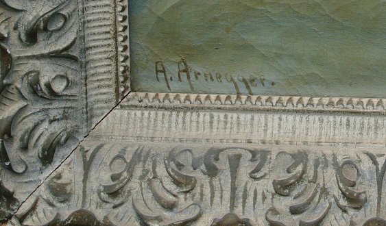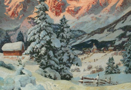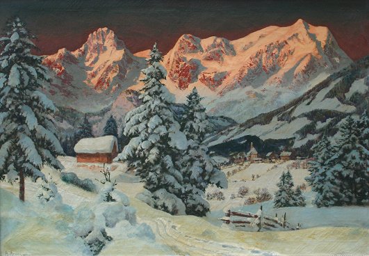 ARNEGGER, Alois: (Austrian, 1879-1967): Alpine Village Scene, O/C, 27'' x 39'', SLL. Condition - Cracklure throughout, needs cleaning.