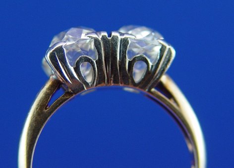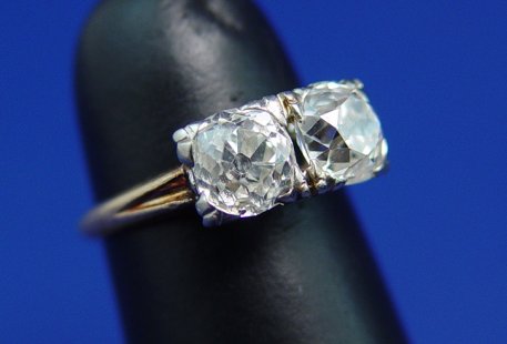 LOVELY LADY'S DIAMOND RING: Two old Euro cut diamonds with open culets, approx. 6 x 6 x 4.2 and 6 x 6 x 4.4, approx. 90pts each, approx. H/I, SI clarity, set in open work corner mount setting of white gold, on a yellow gold shank, marked 14k, size 4.75, 2.8 grams.
