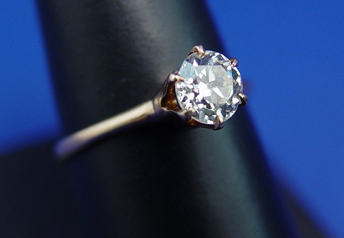 70pt DIAMOND SOLITAIRE: Round brilliant cut diamond with open culet, 5.8 x 5.8 x 3.7, approx. 72pts, off color, SI clarity, set in 6 prong solitaire mount of 14k (assay) gold with a rosy glow, size 8.5, 2.2 grams.