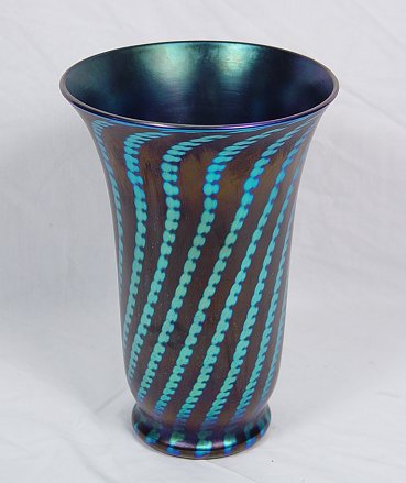 LARGE BLUE ART GLASS VASE: Lighter blue striations, Although this vase is signed L. C. Tiffany Favrile, we do not guarantee it's authenticity or genuineness. 11 ½''h x 8 ¼''dia. No chips, cracks, or repairs. Est. $1500/2500**