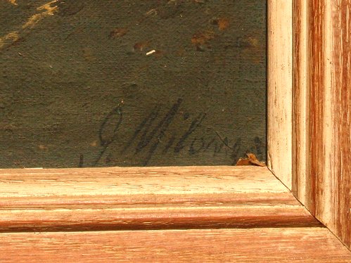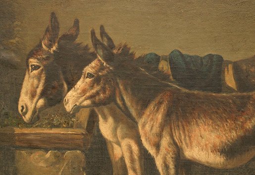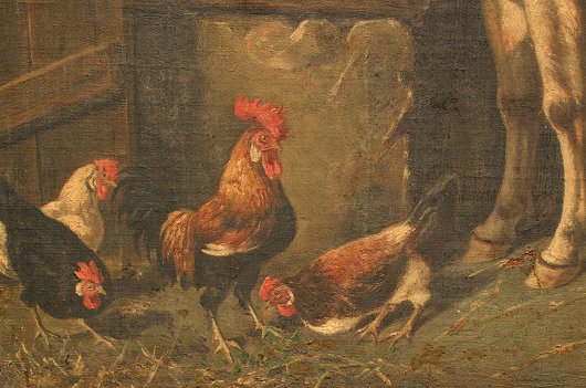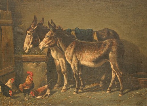 MILONE, G, (Italian, 19/20th C.): Courtyard Scene with Burros and Chickens, O/C/B, 17'' x 23'', SLR, this is possibly done by Giuseppe Milone. Condition - Laid on board, small tear in little burro's nose and near front feet, puncture in upper margin, bubble in left margin, needs cleaning. Est. $300/500**