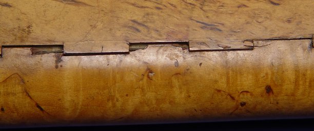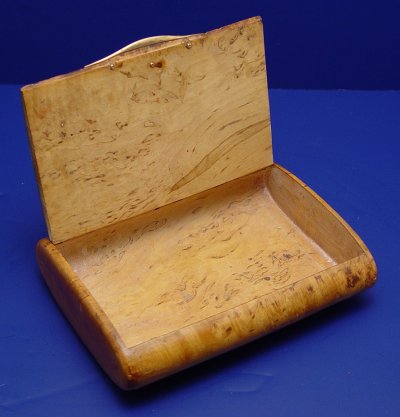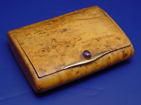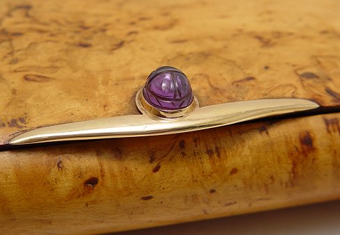 BURLED OLIVEWOOD BOX W/14K GOLD & SCARAB CLASP: Hand crafted from a single piece of wood. Featuring a gold clasp with amethyst scarab. 1 1/2''h. x 6 1/2''l. x 5''.