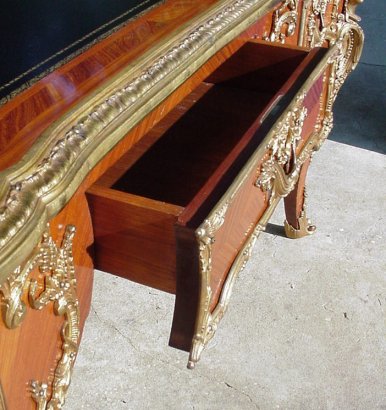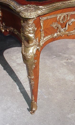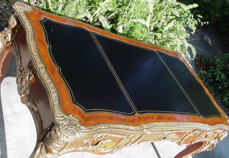 FRENCH ORMOLU BUREAU PLAT DESK: Heavy ormolu ornamentation, black leather top on a three drawer writing table. 70'' X 38'' X 30 1/2''h.