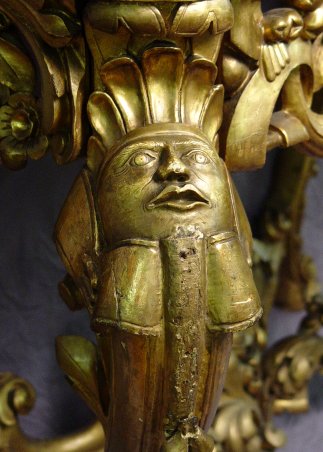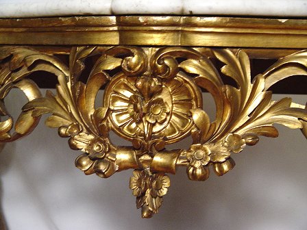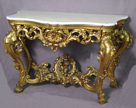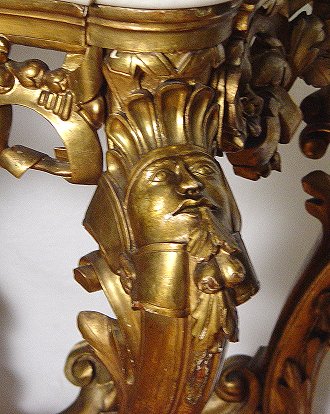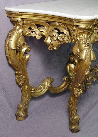 RICHLY CARVED 19TH C FRENCH GILTWOOD CONSOLE TABLE: Beveled and shaped white marble sits atop a deeply carved bowed table. Note the unusual head masquerons heading each leg. 38''h, 29 3/4'' deep, the marble is 58''wide, the table is 64'' wide overall. Est. $7000/9000**