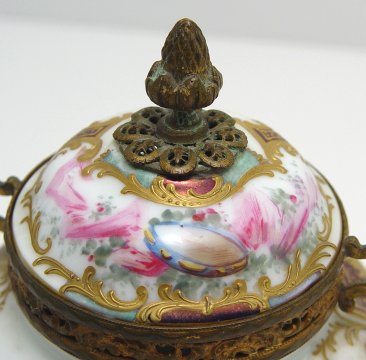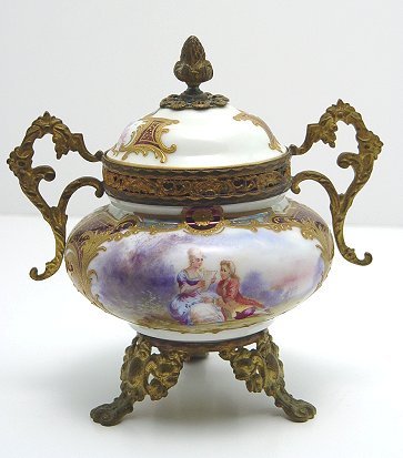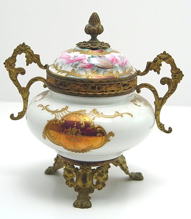 FRENCH PORCELAIN GILT METAL MOUNTED CENSOR: Hand painted scene with raised gold decoration. Gilt metal mounts, the legs, handle and finial. 6 1/2''h, 5 1/2''w.