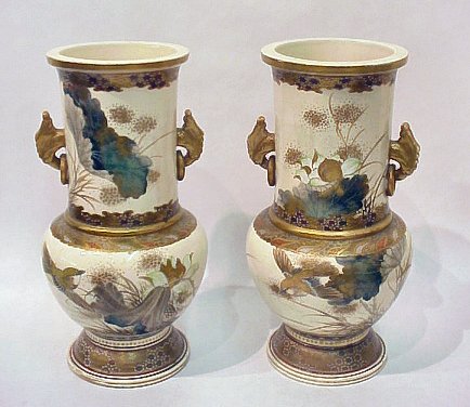 PAIR OF FINE JAPANESE SATSUMA VASES: High quality Japanese earthenware decorated in a birds. Each a bit different from the other. 12 1/2''h., 5 1/4'' dia.