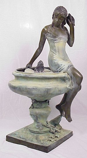 BRONZE FIGURAL FOUNTAIN after MOREAU: Maiden with seashell to her ear, while frog on a lily pad watches. Delicate branches encircle base and pedestal. 40 1/4''h, x 24''dia. Base is 15 1/4'' x 15 1/4''. Signed Aug. Moreau.